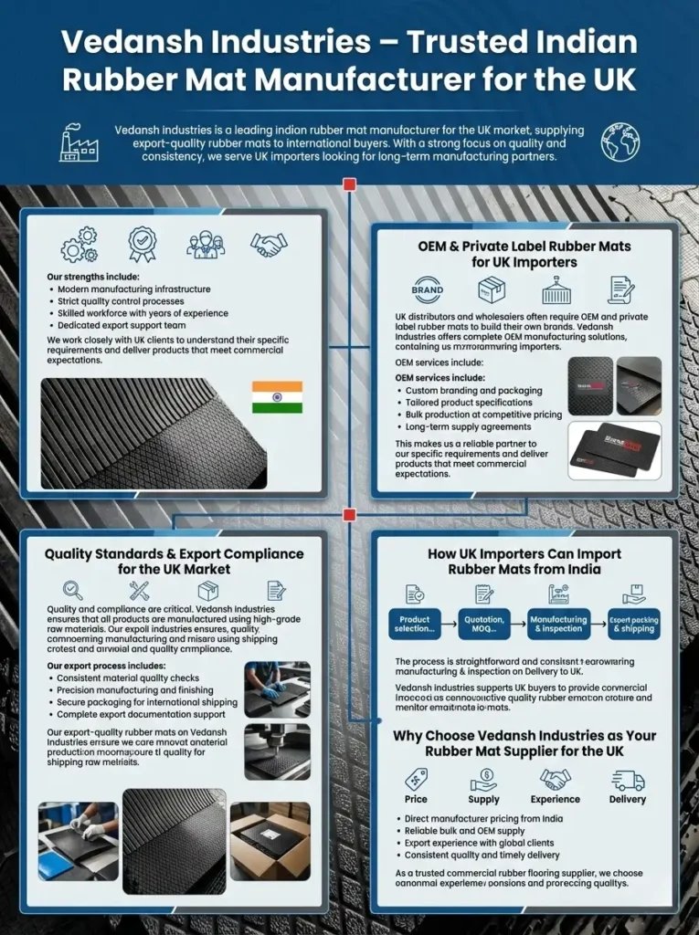 If you are looking for a reliable Indian rubber mat manufacturer for UK import, Vedansh Industries is your trusted partner. We supply export-quality rubber mats from India with flexible OEM options and global shipping support.